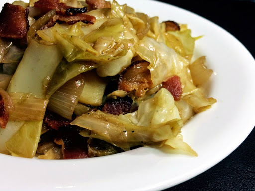Add chopped bacon to a large pot. Cook over medium heat until extra crispy. Remove bacon from pot, leaving the grease. Add cabbage to pot and cook over medium high heat for 10 minutes, Stirring every minute or so. Add onion and continue cooking 5 more minutes, still stirring every minute. Add Worcestershire, apple cider vinegar, garlic powder, & brown sugar. Reduce heat to medium and continue cooking for 20 – 30 minutes, stirring occasionally, until cabbage is cooked through. Add cooked bacon to cabbage and taste to adjust seasoning. Serve.