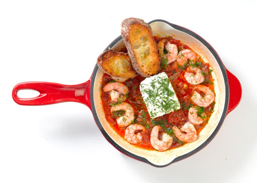 Saganaki, a traditional Greek preparation named after the pan in which it's prepared, is best served straight from the skillet, with plenty of toasted bread for scooping up the savory tomato sauce. If you can find them, wild American shrimp and high-quality Greek feta really make this dish special.