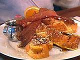 Combine eggs, heavy cream, orange zest and juice, cinnamon and ground nutmeg in a shallow wide dish. Dip the slices of bread into the egg mixture allowing it to soak in on both sides. Transfer to each piece to the hot griddle and cook until golden brown on both sides, about 3 minutes per side. Try to flip only once.