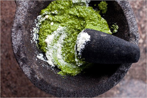 1. Turn on a food processor fitted with the steel blade, and drop in the garlic cloves. When they are chopped and adhering to the sides, stop the machine, scrape down the sides of the bowl and add the walnuts. Turn on the machine, and process until they are finely ground. Scrape down the bowl again, and add the arugula and the salt. Pulse until the arugula is finely chopped, then turn on the machine and run while you slowly drizzle in the olive oil. When the mixture is smooth, stop the machine, scrape down the sides and process for another 30 seconds or so. Scrape out into the bowl of a mortar and pestle. Grind the mixture with the pestle for a smoother texture. Work in the cheese and combine well.