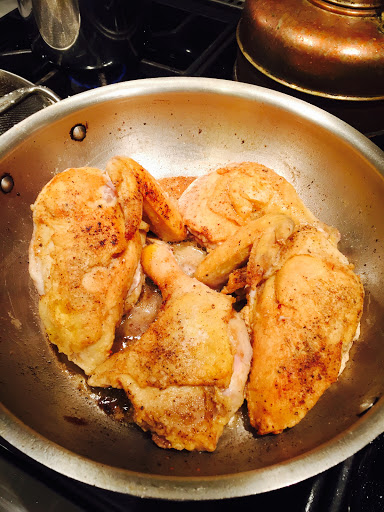 3. Place the oil and butter in a large oven-proof skillet (with lid). Place the pan over medium-high heat, and when the oil is hot, but not so hot as to let the butter burn, place three to four pieces of chicken in the skillet and brown on one side, and turn and brown on the other, about 4 to 5 minutes total. Remove the chicken from the skillet and repeat with the remaining chicken. Place all the sauteed chicken back in the pan, and place a lid on the pan. Place the pan in the oven.