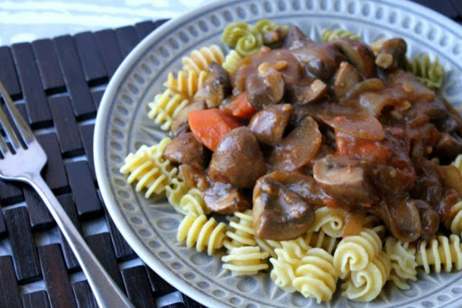 Quarter mushrooms and slice onions and carrots into bite-size pieces. Mince garlic.