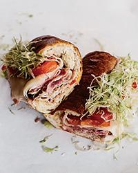 Bake the closed hoagie rolls for 3 minutes, until warm. Spread the aioli on the cut sides. Top the bottom halves with the peppers, meats and cheese. Bake for 5 minutes, until the cheese melts. Top with the tomatoes and oregano and season with salt and pepper. Pile the lettuce on top, drizzle on the vinegar and remaining 1/4 cup of olive oil and serve.