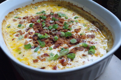 Set aside a couple of tablespoons of the bacon and green onions to use as topping after the dip is baked.