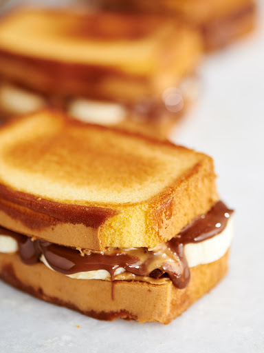 Spread 1 side of 5 pound cake slices with half of the softened butter and then place them, butter-side down, on a piece of parchment paper. Spread a teaspoon of peanut butter on the inside of all 10 slices. Arrange the bananas over the pound cake slices on the parchment paper. Place 4 squares of the Hershey’s chocolate on top of the banana. Top with the other 5 slices of pound cake and spread all the outside tops with the rest of the butter. Press together gently.