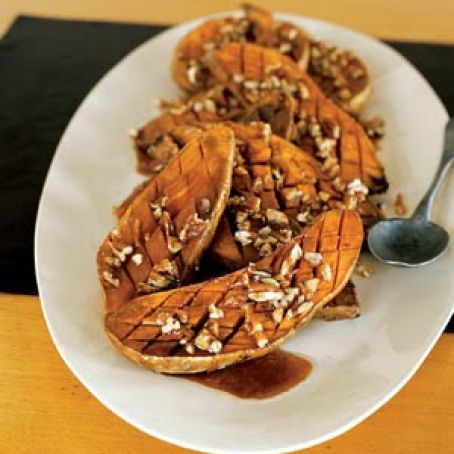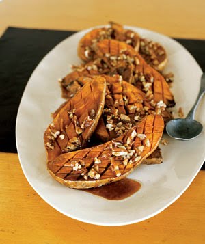 Peel yams and cut in half lengthwise. Place yams in 2-quart utility dish. Season with salt. Sprinkle with pecans. Pour sauce over yams. Heat on full power for 2 1/2 to 4 1/2 minutes, or until heated through and bubbling. Great at Christmas!