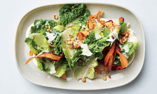 Spoon remaining lemon cream onto a platter and top with salad. Shave cheese over salad and top with cracked pepper, sea salt, and remaining hazelnuts.