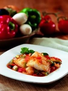 Hornear el conjunto 8-10 m a 180º. Servir en el plato un poco de pisto, colocar encima el bacalao y regar con la vinagreta de olivas negras.