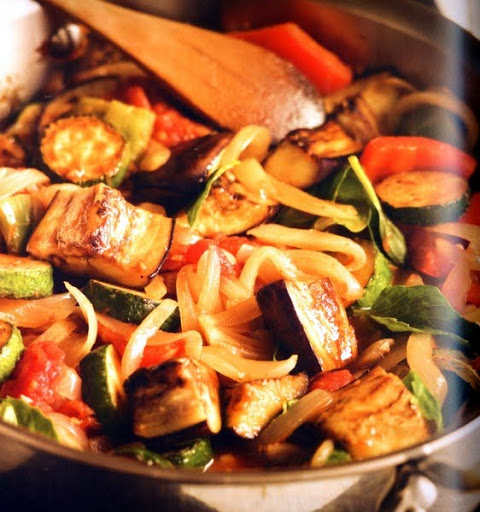you may finish the ratatouille with several heaping spoonfuls of freshly made Basil Pesto (page 246), fresh oregano, lots of sliced green onions or parsley. For a more Mediterranean flavour, try adding lots of kalamata-style black olives or artichoke hearts. You can add a delicious grilled flavour to ratatouille by grilling the eggplant, zucchini and peppers and tossing them with the stewed tomato mixture and basil.