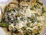 Meanwhile, cut the asparagus diagonally in 1 1/2-inch lengths and discard the tough ends. Blanch in boiling salted water for 4 to 5 minutes, until al dente. Drain and cool immediately in ice water. (If using fresh peas, blanch them in boiling water for a few minutes until the starchiness is gone.)