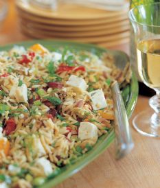 Meanwhile, cook the orzo in boiling salted water for 7 to 9 minutes, until tender. Drain and transfer to a large serving bowl.