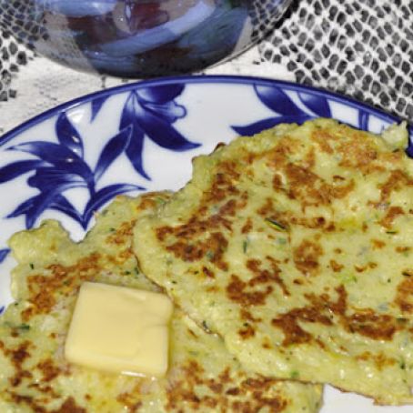 Peel strips off the rind from the zucchini leaving sections of rind still in tact so it is striped. Chop and put into food processor with the onion. Chop until fine. Put in a bowl and mix remaining ingredients. Pour a little olive oil in a skillet and when skillet is hot, pour or spoon about 3-4 Tbsp of the batter and spread out to make a 4-5 inch cake. Cook on low for about 5 minutes on each side or until brown on each side and serve with butter, salt and pepper or maple syrup.