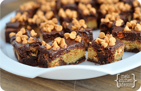 For the chocolate batter, combine the butter and chocolate in a microwave-safe bowl and cook until the butter and chocolate are melted. Whisk until smooth. Add the sugar and stir to combine. Whisk in the eggs and vanilla. Mix in the flour, baking powder and salt until the batter is smooth. Stir in the chocolate chips.