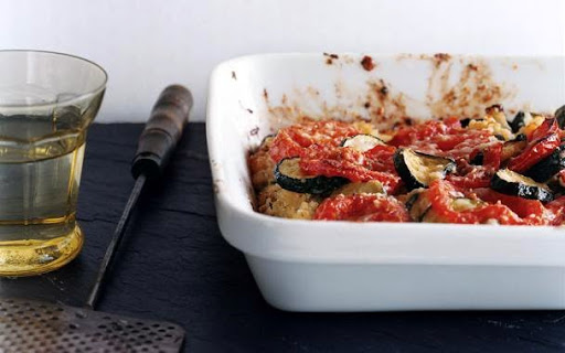 Spread remaining rice mixture over zucchini, then top with remaining zucchini. Top with tomatoes and drizzle with remaining 2 tablespoons oil, then sprinkle with remaining 1/4 cup cheese.