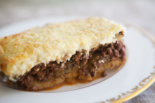 Bake for 30 minutes. Raise the heat to 400 F and bake 15 minutes, until the bechamel is toasty brown. Let the moussaka rest at room temperature for 10 minutes before serving it.