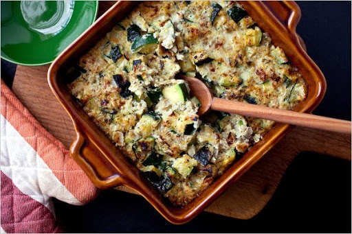 1. Preheat the oven to 375 degrees. Oil a two-quart baking dish or gratin. Heat the olive oil over medium heat in a large, heavy skillet, and add the onion. Cook, stirring, until tender, about five minutes. Add a generous pinch of salt and the garlic. Cook, stirring, until fragrant, 30 seconds to a minute. Add the summer squash, thyme and rosemary. Cook, stirring often, until the squash is tender but not mushy, about 10 minutes. Season to taste with salt and pepper, and remove from the heat.