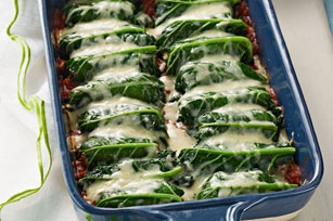 Heat oven to 350°F. Pour pasta sauce into 13x9-inch baking dish sprayed with cooking spray. Add 1/2 cup shredded cheese, Parmesan and egg to meat mixture; mix well. Spoon onto kale leaves, adding about 3 Tbsp. to each. Tuck in both short ends of each leaf, then roll up starting at one long side. Place, seam sides down, over sauce in dish; top with remaining shredded cheese. Cover.