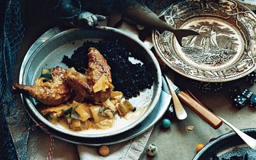 - FRICASSEE OF GAME HEN WITH CREAMY LEEKS AND VADOUVAN