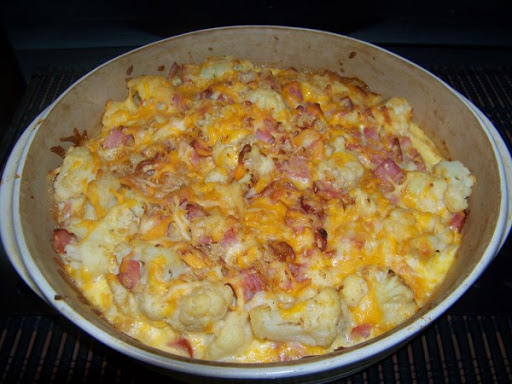 - 1 pound ham 1 16 oz bag frozen cauliflower, or mix with broccoli 2 cups taco cheese, shredded 1 egg 1/2 cup almond milk 1/4 cup heavy cream 1 Tablespoon dried minced onion 1 teaspoon garlic powder 1/4 cup crushed pork rinds, optional