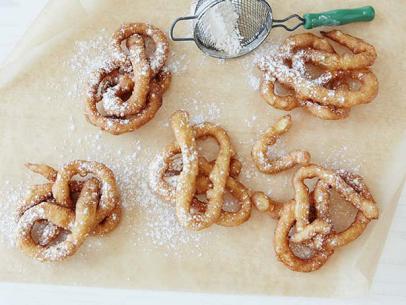 Boil water, butter, sugar, and salt together in a saucepan. Add flour and work it in until it is all incorporated and dough forms a ball. Transfer mixture to the bowl of a standing mixer and let cool for 3 to 4 minutes. With mixer lowest speed, add eggs, 1 at a time, making sure the first egg is completely incorporated before continuing. Once all eggs have been added and mixture is smooth, put dough in a piping bag fitted with a number 12 tip. Heat about 1 1/2 inches of oil in a heavy pan. Pipe dough into oil, making a free-form lattice pattern; cook until browned, flipping once. Remove cake from oil, drain on paper towels, and top with powdered sugar. Continue until all of the batter is used.