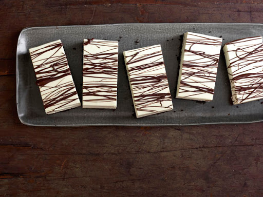 Make the crust: Line a 9-by-13-inch baking dish with foil, leaving an overhang. Put the butter and chocolate in a microwave-safe bowl; microwave in 30-second intervals, stirring, until melted and smooth. Pulse the cookies with the sugar in a food processor until finely ground. With the motor running, pour in the warm melted chocolate mixture and process until combined. Press the crumb mixture into the bottom of the prepared pan and refrigerate while you make the filling.