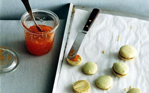 Sandwich flat sides of half of macarons together with a thin layer of jam.
