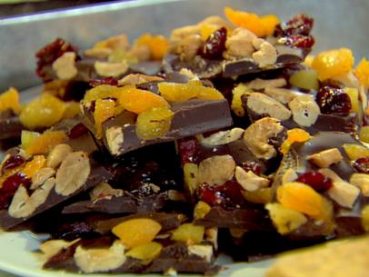 Pour the melted chocolate over the paper and spread to form a rectangle, using the outline. Sprinkle the cashews, apricots and cranberries over the chocolate. Set aside for 2 hours until firm. Cut the bark in 1 by 3-inch pieces and serve at room temperature