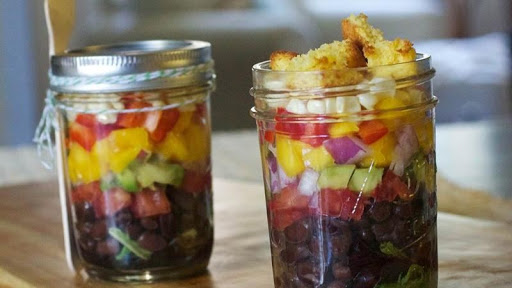 Every bite is interesting in this Southwestern treat. The mason jar presentation displays all the crunchy fruit and veggie goodness, and the cornbread croutons are a terrific buttery finish