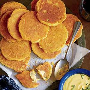 3. Brush 1 Tbsp. oil on a hot griddle. Drop cornmeal mixture by 1/8 cupfuls onto hot griddle. Flatten to 1/2 inch thick, and cook 1 1/2 to 2 minutes on each side or until golden. Repeat process with remaining batter and oil.