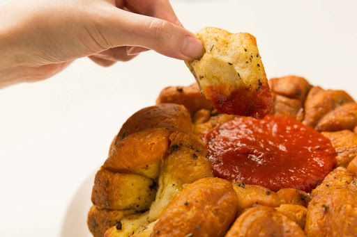 Pull pieces of garlic bread from the bowl and dip away.