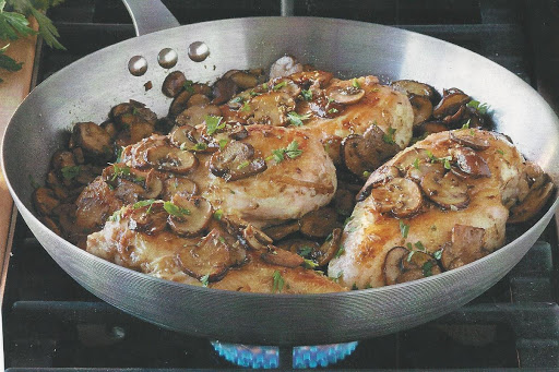 Heat olive oil in large heavy skillet over medium-high heat. Sprinkle chicken with salt and pepper; dust with flour. Add chicken to skillet; saute until brown, about 2 minutes per side. Using tongs, transfer chicken to plate. Add mushrooms, garlic and oregano to same skillet. Saute until mushrooms are brown, about 5 minutes, and then until garlic is lightly golden. Add broth, lemon juice and wine and boil until sauce is slightly reduced, about five minutes. Add chicken to sauce. Reduce heat and simmer uncovered until chicken is cooked through, about 2 minutes preside. Season with salt and pepper. Transfer chicken and mushroom sauce to platter. Sprinkle with parsley.
