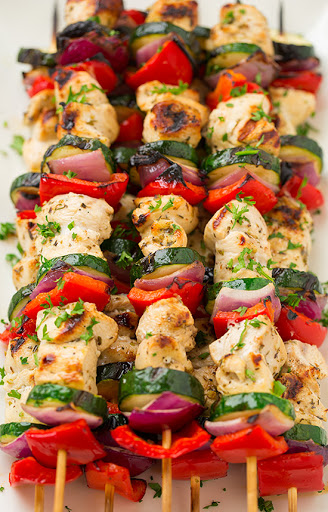 Preheat a grill over medium-high heat. Thread a red bell pepper, red onion, zucchini, 2 chicken pieces on to skewer and repeat twice. Brush grill lightly with olive oil, place skewers on grill and grill until chicken registers 165°F in center, about 7 - 9 minutes, rotating once halfway through cooking. Garnish with parsley, serve warm with Tzatziki sauce.