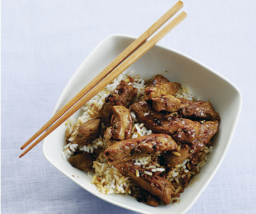Just before serving, uncover the rice and fluff it with a fork. Serve the chicken and sauce over the rice.