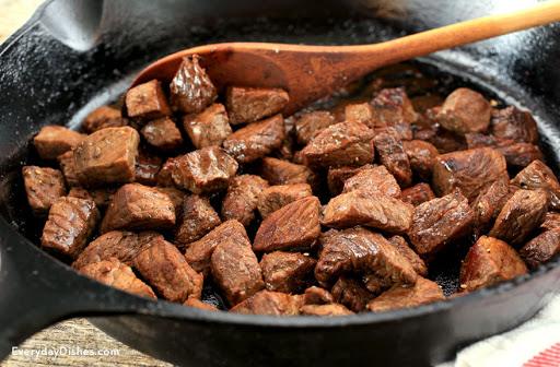 Heat a large heavy-bottom skillet, preferably cast iron, over medium-high heat and allow it to become very hot. Add 1 Tbsp butter and swirl the pan to melt butter and coat the bottom of pan. Immediately scatter half of seasoned steak cubes evenly across the bottom of pan and allow it to cook, undisturbed, for about 1 minute before stirring to cook on other sides.