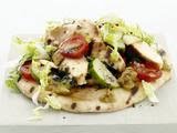 Brush the pitas with the remaining 1 tablespoon olive oil and season with salt. Grill, turning once, until marked. Place a pita on each plate and spread with baba ghanoush. Top with lettuce and chicken salad and drizzle with any juices from the bowl.