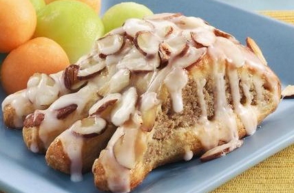 5. Lightly brush egg-milk mixture over each pastry. Place almonds on plate; turn each pastry upside down onto almonds and press gently so almonds stick to dough. Place almond side up on cookie sheet, spreading each cut slightly to form claw shape. Sprinkle remaining almonds over top of pastries.