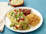 Brush a rimmed baking sheet with some of the butter-oil mixture. Spread 2 tablespoons refried beans down the center of each tortilla, leaving a 2-inch border on both ends. Top with 1 cup chicken mixture and 1/4 cup cheese. Fold in the ends and roll up.