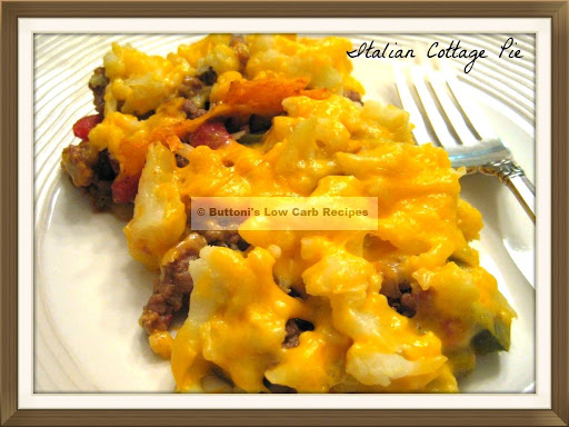 Steam, boil or microwave the cauliflower until tender. While that is cooking, in a 10″ skillet over medium-high heat, brown the crumbled ground beef and Italian sausage until no longer pink. Add onion and green pepper and saute together with meat until onion is translucent. Add tomatoes, garlic, salt, pepper and oregano. Preheat oven to 350º. Simmer meat mixture until the tomatoes are beginning to fall apart and most of the liquid has been absorbed. All the vegetables will be fully done in the mixture at this point. Now drain any liquid off the cauliflower and lightly mash lightly with a fork (or puree with butter and cream). Spread cauliflower over the meat mixture. Top with grated Cheddar and bake at 350º for 30 minutes or until cheese is thoroughly melted. Serve with your favorite salad.