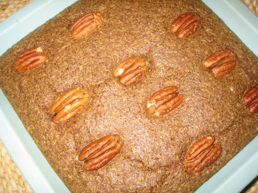 6) Sprinkle with pecans (optional) and bake for approximately 18 to 22 minutes, or until a toothpick inserted in the centre of the cake comes out clean.