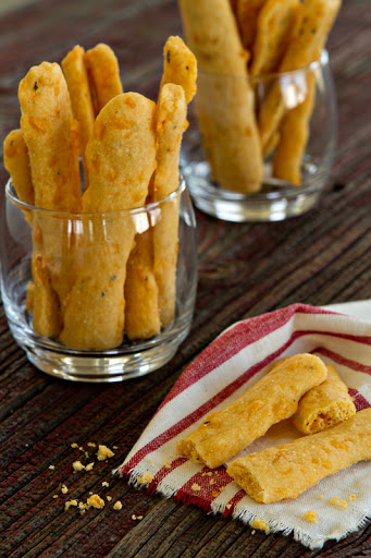 4. Lightly flour a work surface and turn the dough onto the surface. Using a rolling pin, roll the dough into a rectangle of 1/2 inch thickness. Use a pizza cutter or sharp knife to cut the dough into strips. Place strips on prepared baking sheet, about 1 inch apart. Bake in preheated oven for 12-14 minutes or until crisp. Allow cheese straws to cool and enjoy!