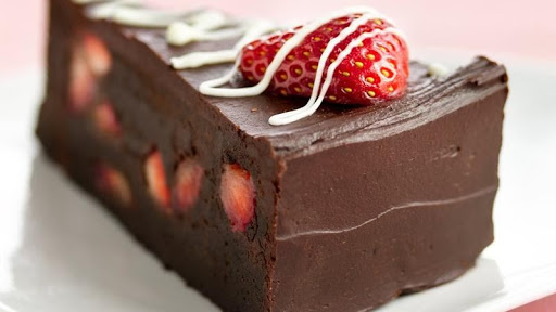 4 Run knife around side of pan to loosen cake mixture. Place serving plate upside down on pan; turn pan and plate over. Frost side and top of cake with reserved ganache. Arrange strawberry halves on top of cake.