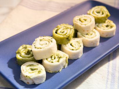 Spread the tortilla with the cheese and pesto. Roll up and slice into pinwheels.