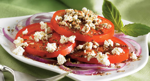 Layer onion and tomato slices on serving plate. Drizzle with dressing. Sprinkle with feta cheese.