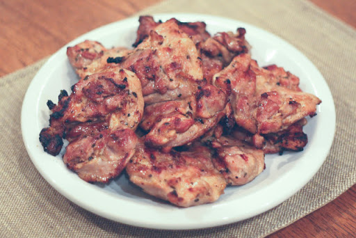 When ready to cook the meat, let the chicken rest on the counter for 30 minutes to an hour prior to cooking. I was marinating boneless skinless chicken thighs this time, so we cooked the meat on medium heat, 6 minutes on each side. Then increased the heat to closer to high and cooked it another 4 minutes. It was absolutely perfect; tender, juicy and loaded with great flavors. Enjoy!