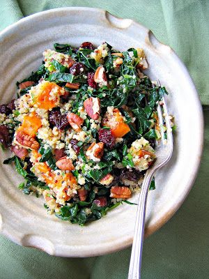 Add the sweet potato cubes and quinoa to the kale, then add the cranberries, toasted and ground cumin, remaining 3 tablespoons olive oil, 1/4 teaspoon salt, and juice of 1 lemon and gently toss to combine. Add the pecans and parsley just before serving.