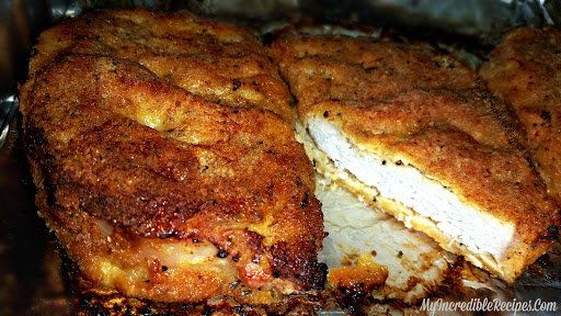 On a plate combine the last 4 ingredients. Rub the pork chops with olive oil and then dip each one in the cheese mixture. Press the mixture over the pork chops to make sure they are well covered in it. Line a pan with foil and spray with cooking spray. Place the pork chops on the pan and back at 350 degrees for 40 - 50 minutes.