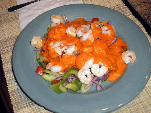 Divide dressing among 4 bowls. Top with vegetables, shrimp, and parsley. Makes 4 servings.