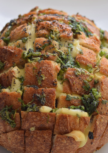 Transfer the bread loaf to the lined baking sheet. Drizzle with butter mixture. If needed, move the green onions around to spread them out.