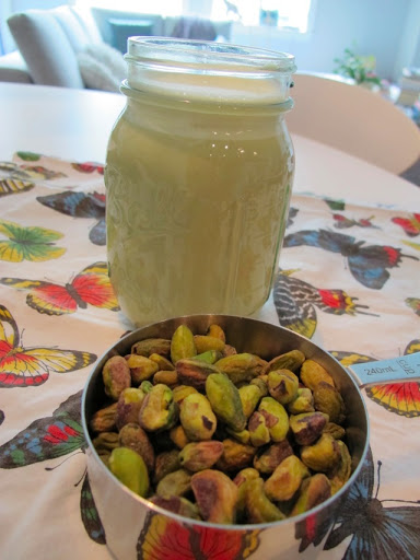 Place pistachio nuts and 4 cups of water, in blender and blend on high for ~ 1 min