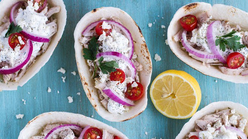 Remove cooked chicken from slow cooker, and shred with 2 forks. Divide chicken among tortillas. Top each with Tzatziki, red onion, grape tomatoes and feta cheese.